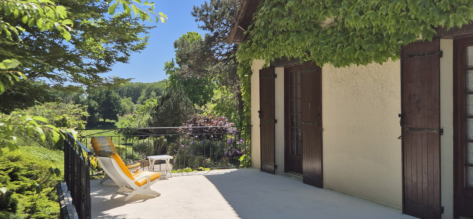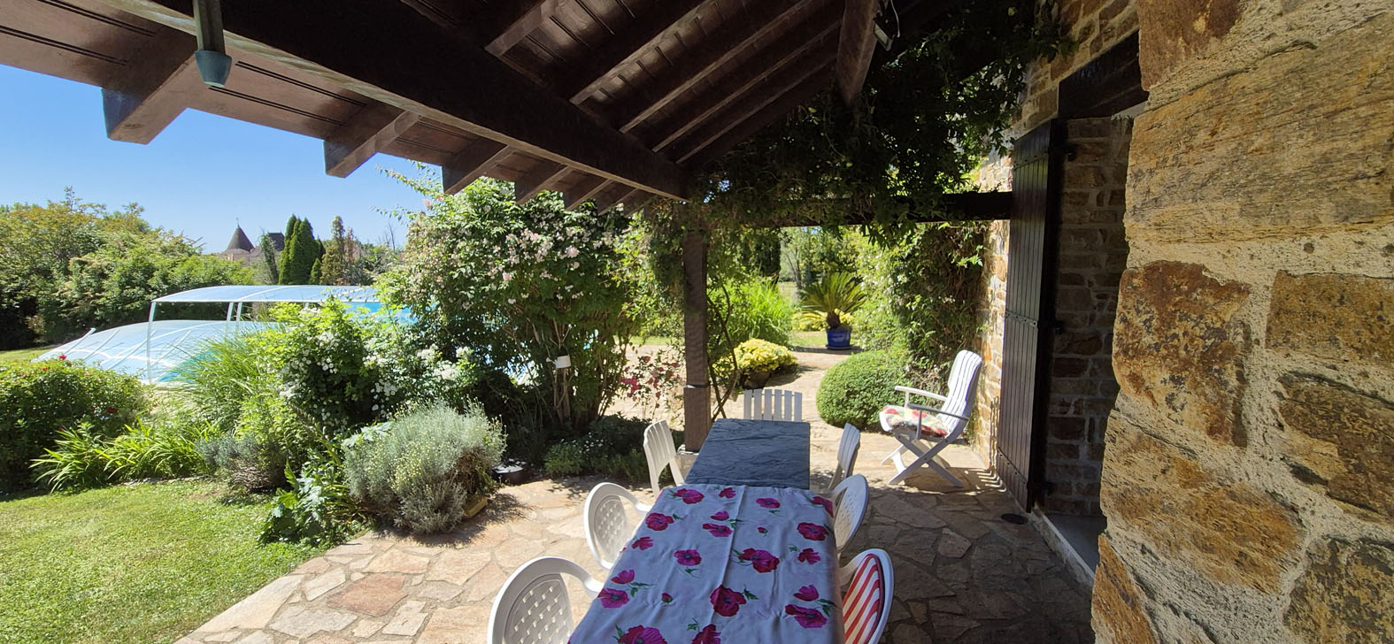 • salle de séjour de 6 x 8,2 avec cheminée en pierre, baie vitrée donnant sur une premièr terrasse couverte de 2,5 x 4,5 m avec barbecue et 2 double porte/fenêtres donnant sur une deuxième terrasse couverte de 3 x 7 m