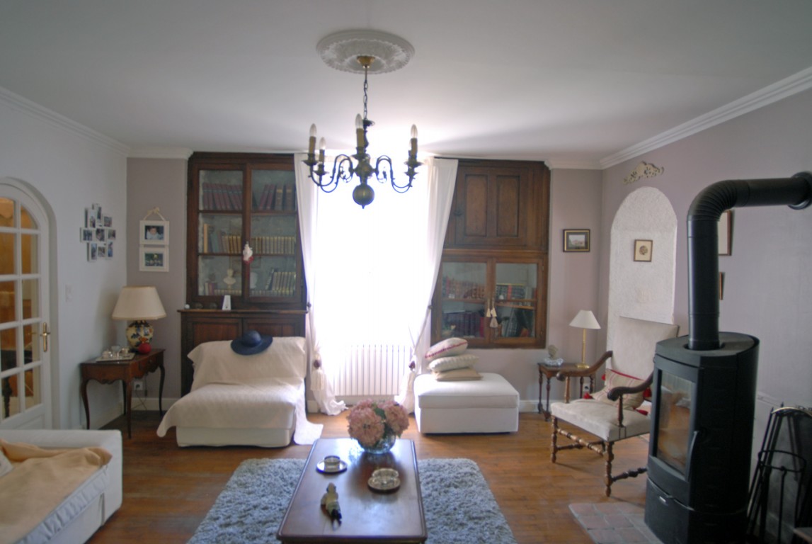 • salon de 4,8 x 4,9 m avec poêle à bois, 2 bibliothèques encastrées et parquet au sol