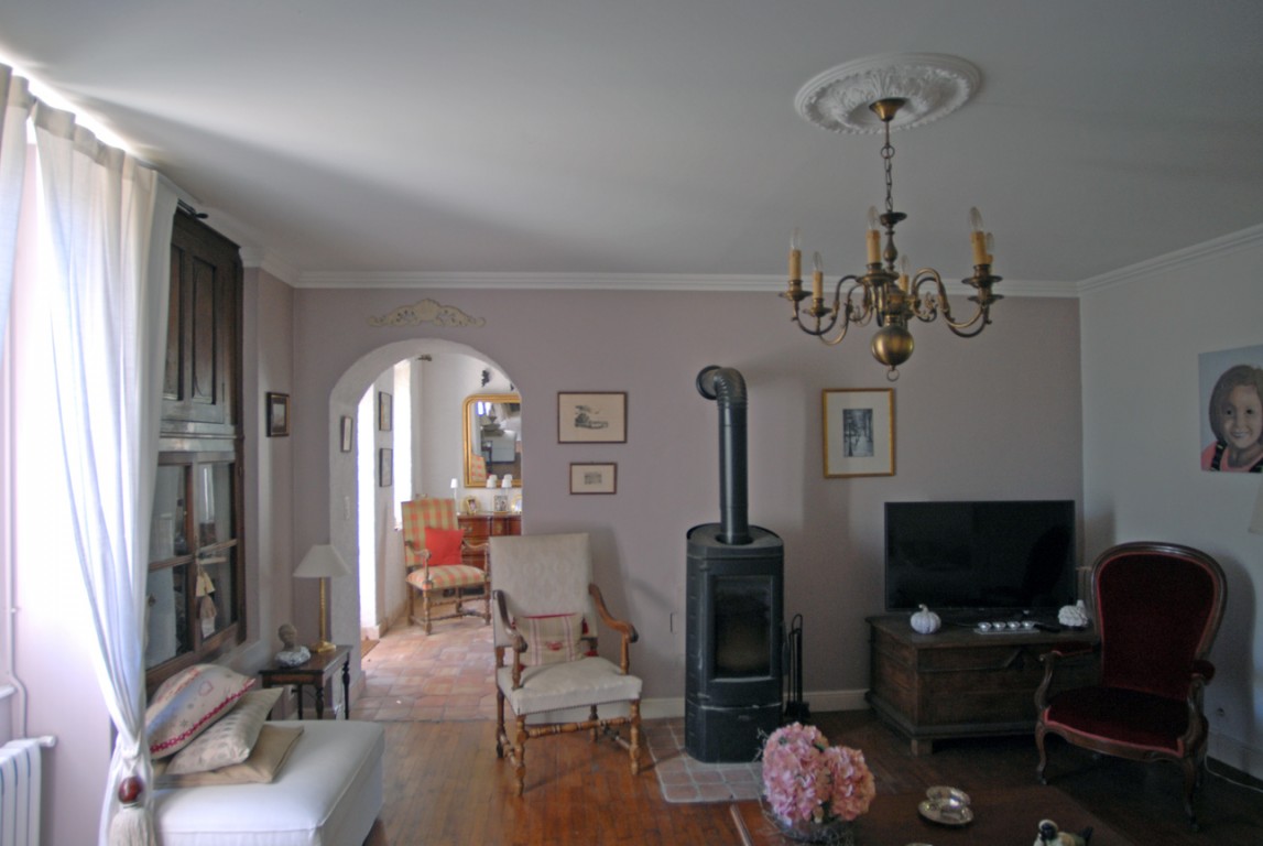 • petit salon de 3,7 x 4,8 m avec cheminée, terres cuites au sol et porte/fenêtre donnant le puits